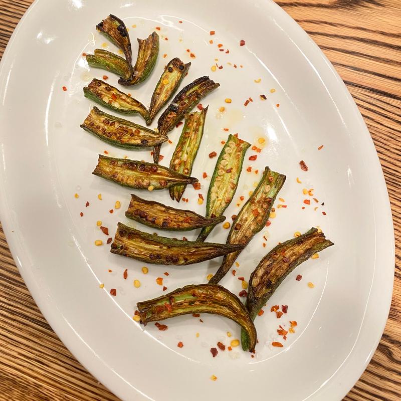 Zesty grilled okra lightly seasoned with sea salt & red chili flakes.